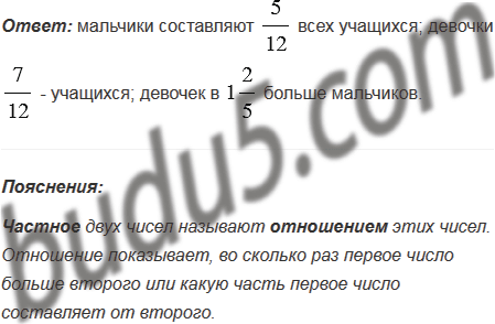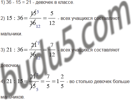 В классе 36 учащихся. Из них 15 мальчиков, а остальные - девочки. Какую часть учащихся составляют мальчики, а какую - девочки? Чему равно отношение числа девочек к числу мальчиков и что оно показывает?
