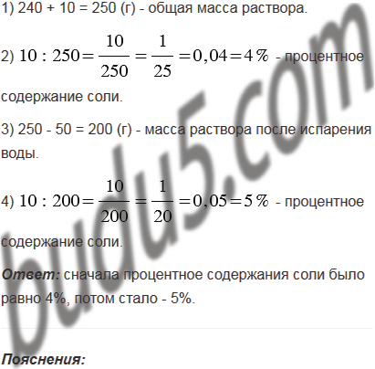 В сосуд налили 240 г воды и положили 10 г соли. Найдите процентное содержание соли в растворе. Через некоторое время 50 г воды испарилось. Каким стало процентное содержание соли в растворе?