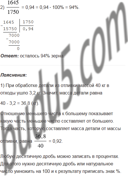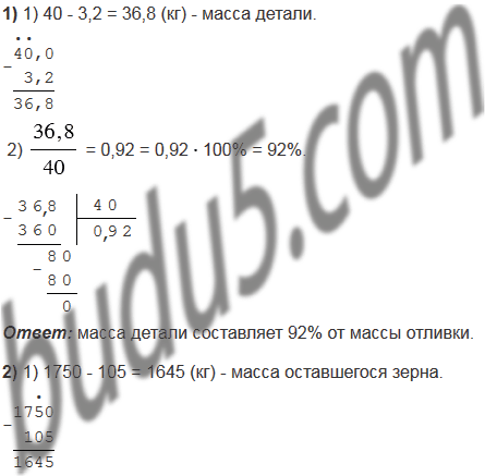 1) При обработке детали из отливки массой 40 кг в отходы ушло 3,2 кг. Какой процент составляет масса детали от массы отливки?