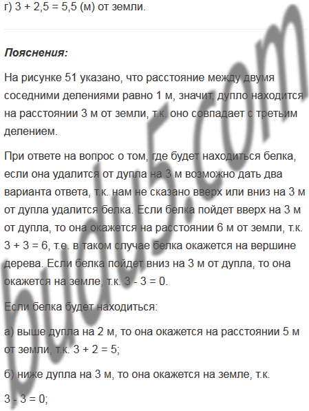 Белка вылезла из дупла и бегает по стволу дерева вверх и вниз (рис. 51). Покажите, где будет находиться белка, если она удалится от дупла на 3 м. Сколько ответов можно дать на этот вопрос? Покажите на рисунке, где окажется белка, если она будет находиться: а) выше дупла на 2 м; б) ниже дупла на 3 м; в) ниже дупла на 1,5 м; г) выше дупла на 2,5 м.