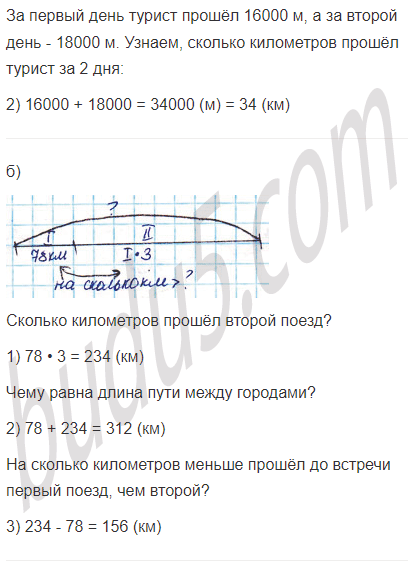 б) Два поезда едут навстречу друг другу из двух городов. Первый поезд прошёл до встречи 78 км, а второй — в 3 раза больше. Чему равна длина пути между этими городами? На сколько километров меньше прошёл до встречи первый поезд, чем второй?