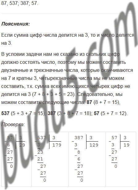 Из цифр 7, 8, 3 и 5 составьте четыре различных числа, оканчивающиеся цифрой 7 и кратные 3.
