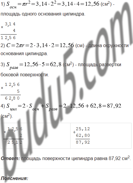 изображен цилиндр. Сверху и снизу цилиндр ограничен кругами, которые называются основаниями цилиндра. Развертка боковой поверхности цилиндра - прямоугольник. На рисунке 12, б изображена развертка поверхности цилиндра. Попробуйте вычислить площадь поверхности цилиндра, если его высота 5 см, а радиус оснований 2 см.