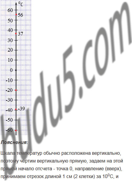 Начертите шкалу температур от -600С до 600С, приняв отрезок длиной 1 см за 100С. Отметьте на этой шкале точку замерзания ртути (-390С), нормальную температуру человеческого тела (370С), точку замерзания бензина (-600С), точку кипения ацетона (560С), точку замерзания глицерина (-200С).