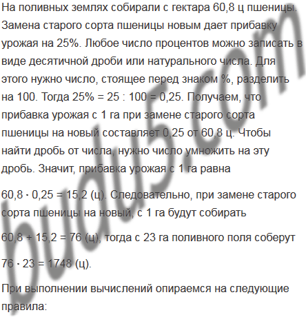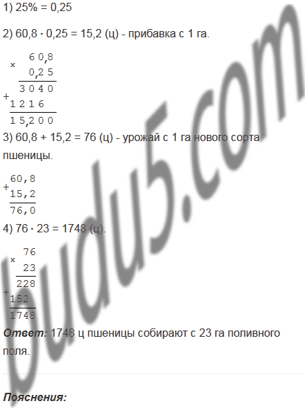 На поливных землях собирали с гектара 60,8 ц пшеницы. Замена старого сорта пшеницы новым дает прибавку урожая на 25%. Сколько теперь пшеницы собирают с 23 га поливного поля?