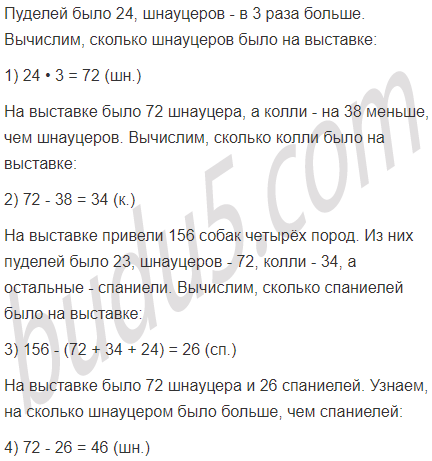 Задание № 10. На выставку привели 156 собак четырёх пород: пуделей, шнауцеров, колли и спаниелей. Пуделей было 24, шнауцеров - в 3 раза больше, чем пуделей, а колли - на 38 меньше, чем шнауцеров. Сколько спаниелей привели на выставку? На сколько шнауцеров было больше, чем спаниелей?