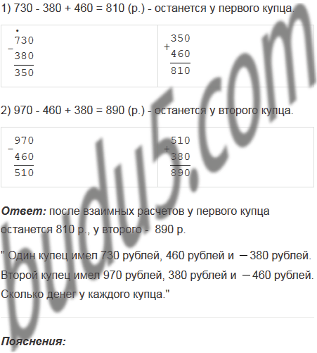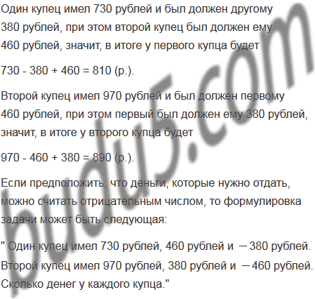 В старинной задаче имеются такие сведения: "Один купец имел 730 рублей и был должен другому 380 рублей. Второй купец имел 970 рублей и был должен первому 460 рублей". Сколько денег останется у каждого купца после взаимных расчетов? Попробуйте сформулировать задачу, используя понятие отрицательного числа.