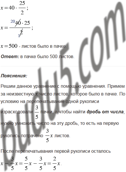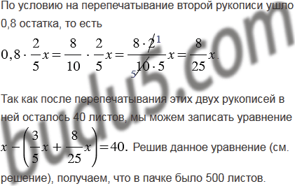 пачки. На перепечатывание другой рукописи ушло 0,8 остатка. Сколько листов листов бумаги было в пачке, если после перепечатывания этих двух рукописей в ней осталось 40 листов?