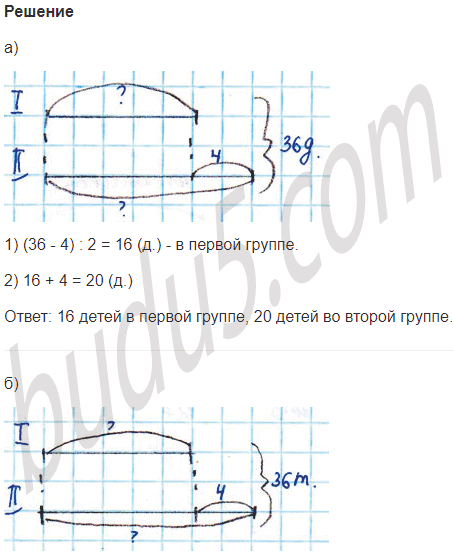 а) В двух группах детского сада 36 детей. В первой группе на 4 малыша меньше, чем во второй. Сколько детей в каждой из этих групп?