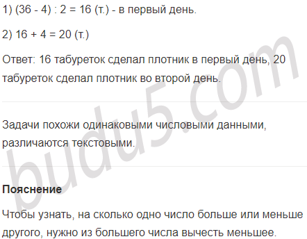 б) За два дня плотник сделал 36 табуреток. В первый день он сделал на 4 табуретки меньше, чем во второй. Сколько табуреток сделал плотник в каждый из этих дней?
