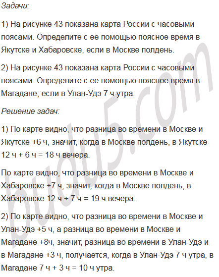 На рисунке 43 показана карта России с часовыми поясами. Определите с ее помощью: а) поясное время в Екатеринбурге и Владивостоке, если в Москве полночь; б) поясное время в Петропавловске-Камчатском, Новосибирске и Калининграде, если в Москве 11 ч утра. Составьте сами и решите несколько задач на определение поясного времени.