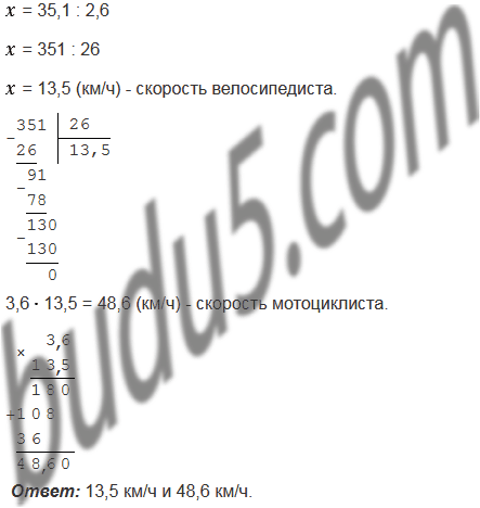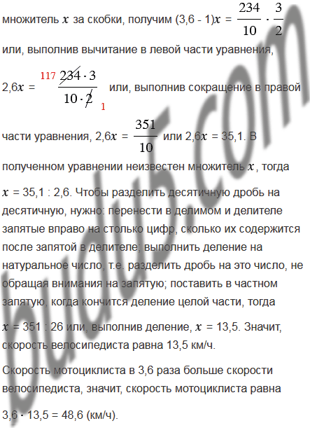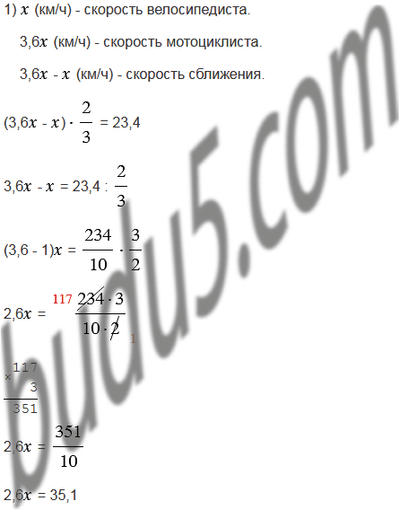 1) Мотоциклист догоняет велосипедиста. Сейчас между ними 23,4 км. Скорость мотоциклиста в 3,6 раза больше скорости велосипедиста. Найдите скорости велосипедиста и мотоциклиста, если известно, что мотоциклист догонит велосипедиста через