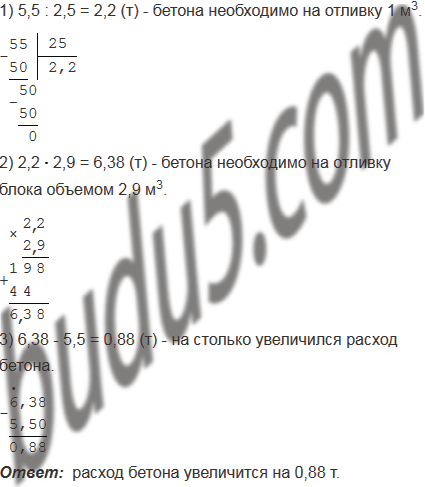 На отливку блока объёмом 2,5 м3 требуется 5,5 т бетона. На сколько увеличится расход бетона при отливке блока объёмом 2,9 м3?