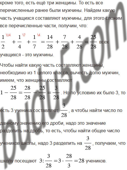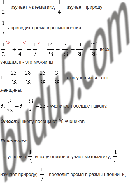 - Вот столько, - ответил учитель. - Половина изучает математику, четверть - природу, седьмая часть проводит время в размышлении, и, кроме того, есть ещё три женщины.