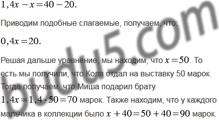 У Миши и Коли в коллекциях было одинаковое число марок. Когда Миша подарил часть своих марок младшему брату, а Коля в 1,4 раза меньшее число своих марок отдал на выставку, у Миши осталось 20 марок, а у Коли 40 марок. Сколько марок было у каждого мальчика первоначально, сколько марок Коли на выставке и сколько марок Миша подарил брату?