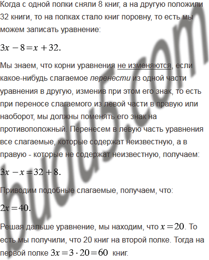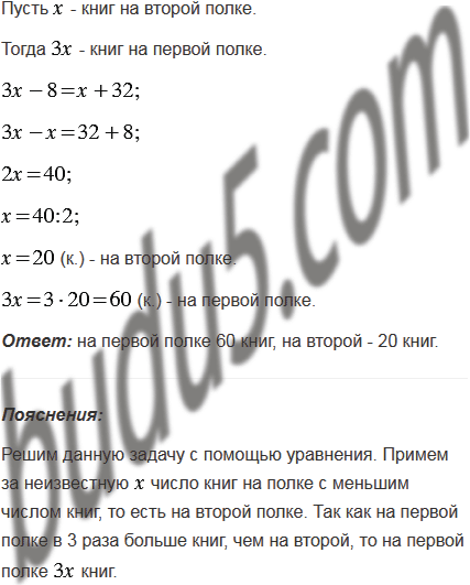 На одной полке было в 3 раза больше книг, чем на другой. Когда с одной полки сняли 8 книг, а на другую положили 32 книги, то на полках стало книг поровну. Сколько книг было на каждой полке первоначально?