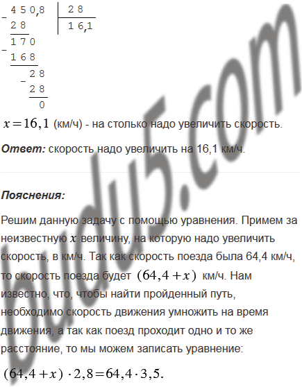 Поезд шёл 3,5 ч со скоростью 64,4 км/ч. На сколько надо увеличить скорость поезда, чтобы пройти это расстояние за 2,8 ч?