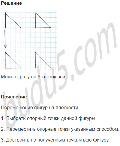 Задание № 5. Нарисуй треугольник. Перенеси его на 6 клеток вправо, затем на 8 клеток вниз, а потом - на 6 клеток влево. Каким одним преобразованием можно заменить все эти преобразования? Покажи его стрелкой.