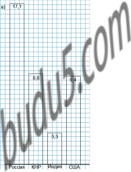 а) площадь России равна 17,1 млн км2, площадь КНР - 9,6 млн км2, площадь Индии - 3,3 млн км2 и площадь США - 9,4 млн км2;