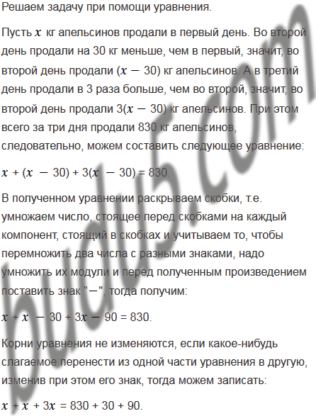 За три дня было продано 830 кг апельсинов. Во второй день продали на 30 кг меньше, чем в первый, а в третий - в 3 раза больше, чем во второй. Сколько килограммов апельсинов было продано в первый день?