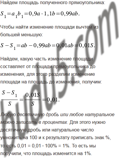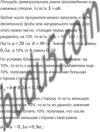 На сколько процентов изменится площадь прямоугольника с измерениями 30 см и 20 см, если бóльшую сторону увеличить на 10%, а другую уменьшить на 10%? Есть ли лишние данные в условии задачи?