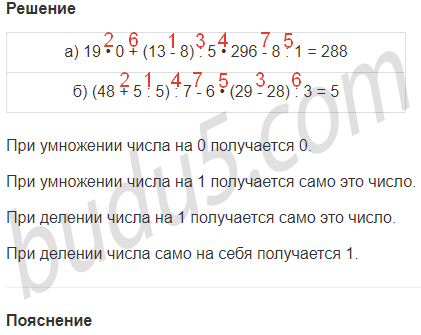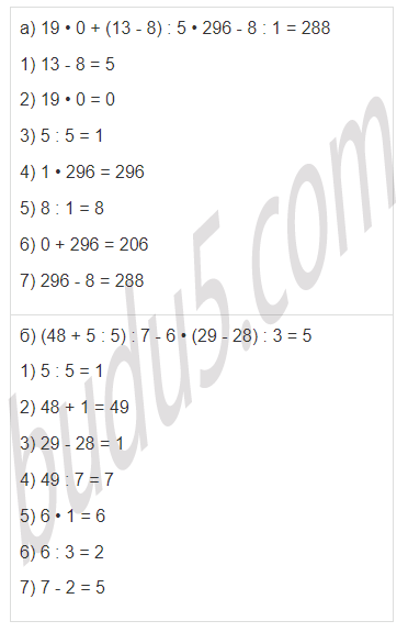 | а) 19 • 0 + (13 - 8) : 5 • 296 - 8 : 1 |