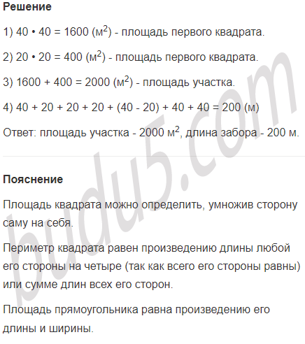 Задание № 13. Участок образован двумя квадратами, как показано на чертеже. Длина стороны первого квадрата 40 м, а второго - 20 м. Найди площадь этого участка. Чему равна длина забора, который его огораживает?
