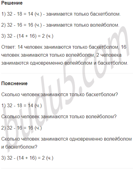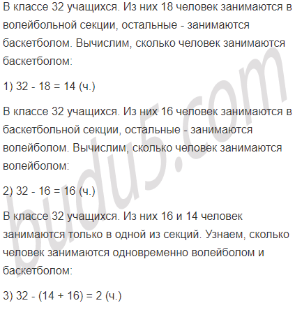 Задание № 15. В классе 32 учащихся. Из них 18 человек занимаются в волейбольной секции, а 16 человек - в баскетбольной. Сколько учащихся занимаются одновременно волейболом и баскетболом? Сколько занимаются только волейболом? Только баскетболом? (Каждый ученик класса занимается хотя бы в одной из этих секций.)