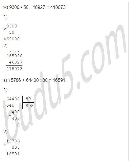 | б) 4790 • 600 | д) 2725800 : 30 | з) 15786 + 64400 : 80 |
