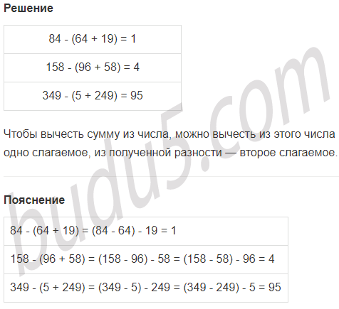 | 84 - (64 + 19) | 158 - (96 + 58) | 349 - (5 + 249) |