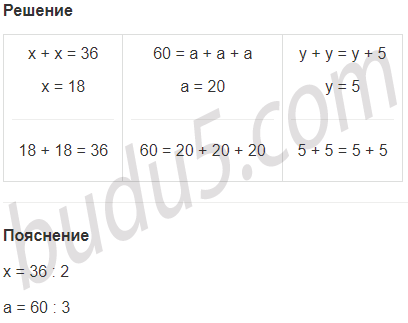 | х + х = 36 | 60 = а + а + а | у + у = у + 5 |