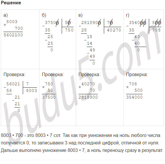 | а) 8003 • 700 | б) 37500 : 50 | в) 218900 : 70 | г) 354000 : 500 |