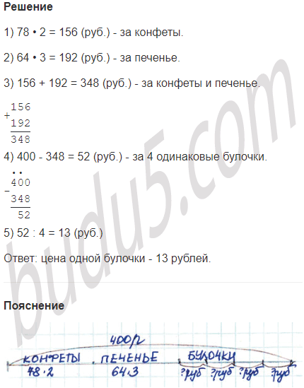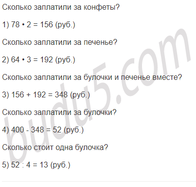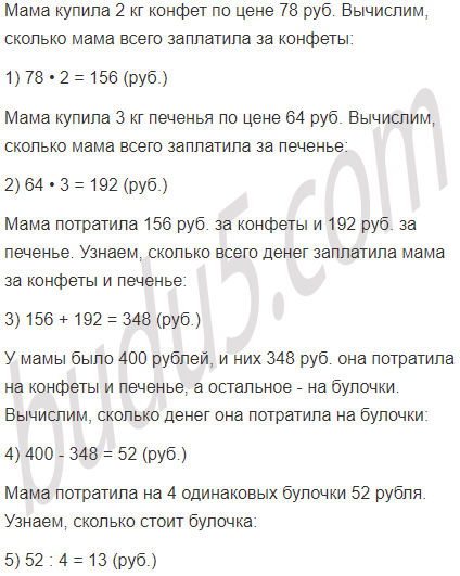 Задание № 8. У мамы было 400 руб. Она купила 2 кг конфет по цене 78 руб., 3 кг печенья по цене 64 руб., а на остальные деньги - четыре одинаковые булочки. Сколько стоит булочка?