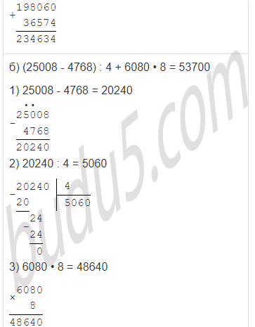 | б) (25008 - 4768) : 4 + 6080 • 8 |