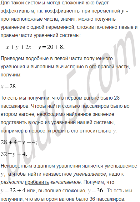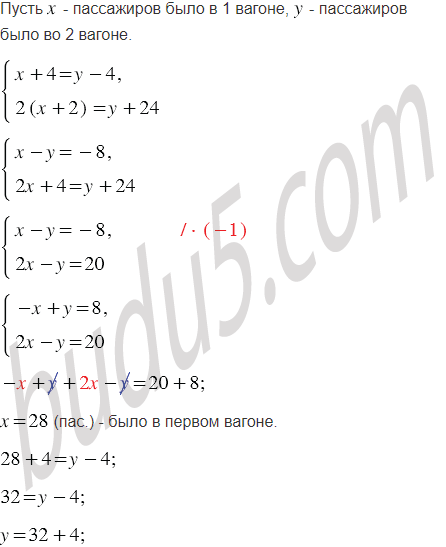 Когда в первый вагон электрички вошли 4 пассажира, а из второго вагона вышли 4 пассажира, то в обоих вагонах пассажиров стало поровну. Если бы в первый вагон вошли 2 пассажира, а во второй - 24 пассажира, то в первом вагоне стало бы в два раза меньше пассажиров, чем во втором. Сколько пассажиров было сначала в каждом вагоне?