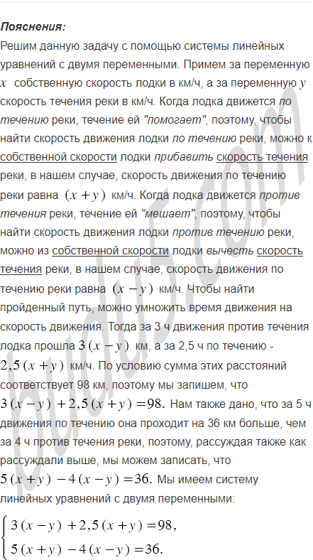 Моторная лодка за 3 ч движения против течения реки и 2,5 ч по течению проходит 98 км. Найдите собственную скорость лодки и скорость течения, если за 5 ч движения по течению она проходит на 36 км больше, чем за 4 ч против течения реки.