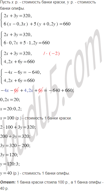 Известно, что 2 банки краски и 3 банки олифы стоили 320 р. После того как краска подешевела на 30%, а олифа подорожала на 20%, за 6 банок краски и 5 банок олифы заплатили 660 р. Найдите первоначальную цену одной банки краски и одной банки олифы.
