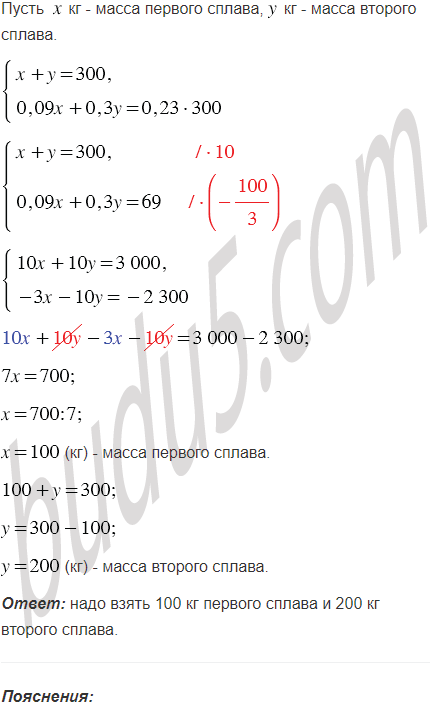 Имеем два сплава меди и цинка. Один сплав содержит 9%, а другой - 30% цинка. Сколько килограммов каждого сплава надо взять, чтобы получить сплав массой 300 кг, содержащий 23% цинка?