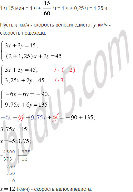 Из двух сёл, расстояние между которыми равно 45 км, одновременно навстречу друг другу отправились велосипедист и пешеход и встретились через 3 ч после начала движения. Если бы велосипедист выехал на 1 ч 15 мин раньше, чем вышел пешеход, то они встретились бы через 2 ч после выхода пешехода. С какой скоростью двигался каждый из них?