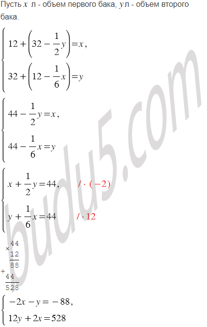 В одном баке было 12 л воды, а в другом - 32 л. Если первый бак долить доверху водой из второго бака, то второй бак останется наполненным на половину своего объёма. Если второй бак долить доверху водой из первого, то первый бак останется наполненным на шестую часть объёма. Найдите объём каждого бака.