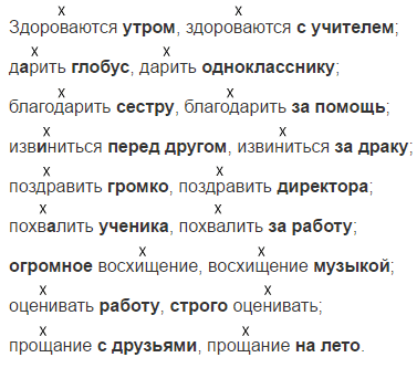 Здороваются (когда? с кем?) ... , ... ; д..рить (что? кому?) ... , ... ; благодарить (кого? за что?) ... , ... ; изв..ниться (перед кем? за что?) ... , ... ; поздравить (как? кого?) ... , ... ; похв..лить (кого? за что?) ... , ... ; восхищение (какое? чем?) ... , ... ; оценивать (что? как?) ... , ... ; прощание (с кем? на какое время?) ... , ...