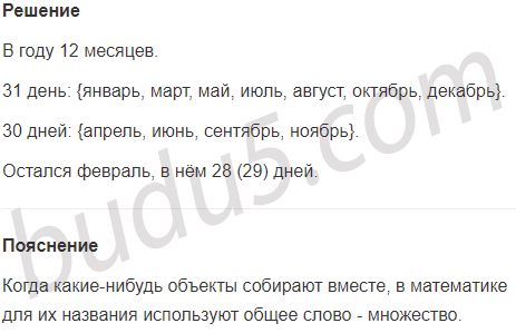 Задание № 1. Рассмотри календарь. Сколько месяцев в году? Запиши множество месяцев, в которых 31 день, и множество месяцев, в которых 30 дней дней. Есть ли идущие подряд месяцы, в которых по 31 дню? Остались ли ещё месяцы?