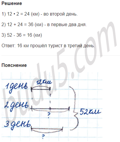 Задание № 9. За 3 дня турист прошёл 52 км. В первый день он прошёл 12 км, а во второй день - в 2 раза больше, чем в первый. Сколько километров прошёл турист в третий день?