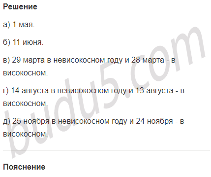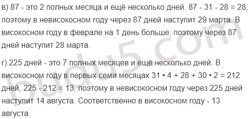 Задание № 8. Определи, какое число и месяц наступили, если от начала года прошло: а) 4 месяца; б) 5 месяцев 10 дней; в) 87 дней; г) 225 дней; д) 328 дней? (Рассмотри год простой и високосный).