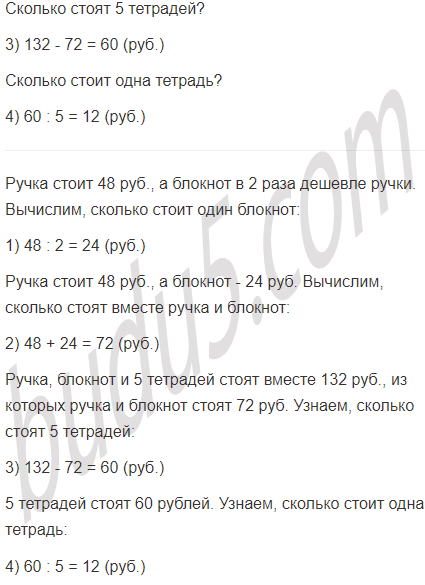Задание № 12. Ручка, блокнот и 5 тетрадей стоят вместе 132 руб. Ручка стоит 48 руб., блокнот в 2 раза дешевле ручки. Сколько стоит одна тетрадь?