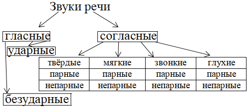 Рассмотрите схему. Расскажите, на какие группы и подгруппы делятся звуки речи в русском языке. Приведите примеры на каждую группу.