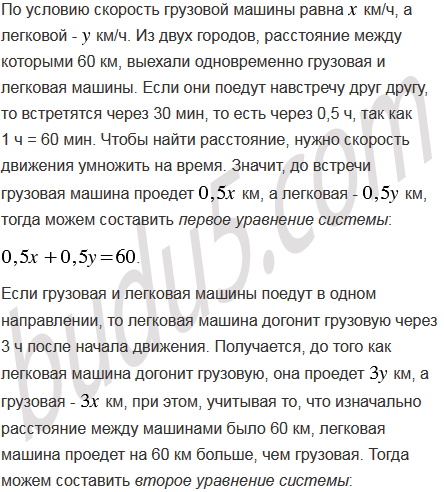 Из двух городов, расстояние между которыми 60 км, выехали одновременно грузовая и легковая машины. Если они поедут навстречу друг другу, то встретятся через 30 мин. Если они поедут в одном направлении, то легковая машина догонит грузовую через 3 ч после начала движения.