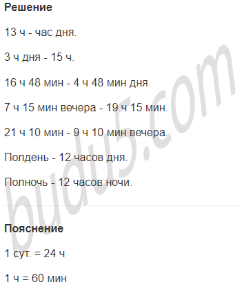 Определи с помощью этой схемы, как по-другому можно назвать: 13 ч, 3 ч дня, 16 ч 48 мин, 7 ч 15 мин вечера, 21 ч 10 мин? О каком времени говорят: полдень, полночь?