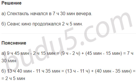 а) Спектакль закончился в 9 ч 45 мин вечера. Когда он начался, если продолжался 2 ч 15 мин?