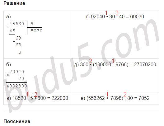 | а) 4563000 : 900 | в) 18520 : 5 • 600 | д) 300 • (100000 - 9766) |